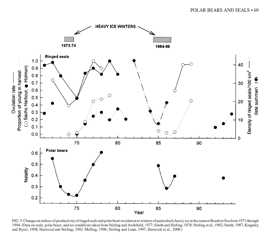Figure 5 from Stirling 2002. Note that “ovulation rate” and “natality” are measures used to assess reproductive success in ringed seals and polar bears, respectively. In effect, what it shows is that during cold, heavy ice winters (1974-74 and 1984-85), the numbers of probably-pregnant seals declined and as a consequence, overall polar bear reproduction declined.
