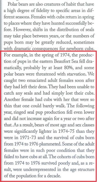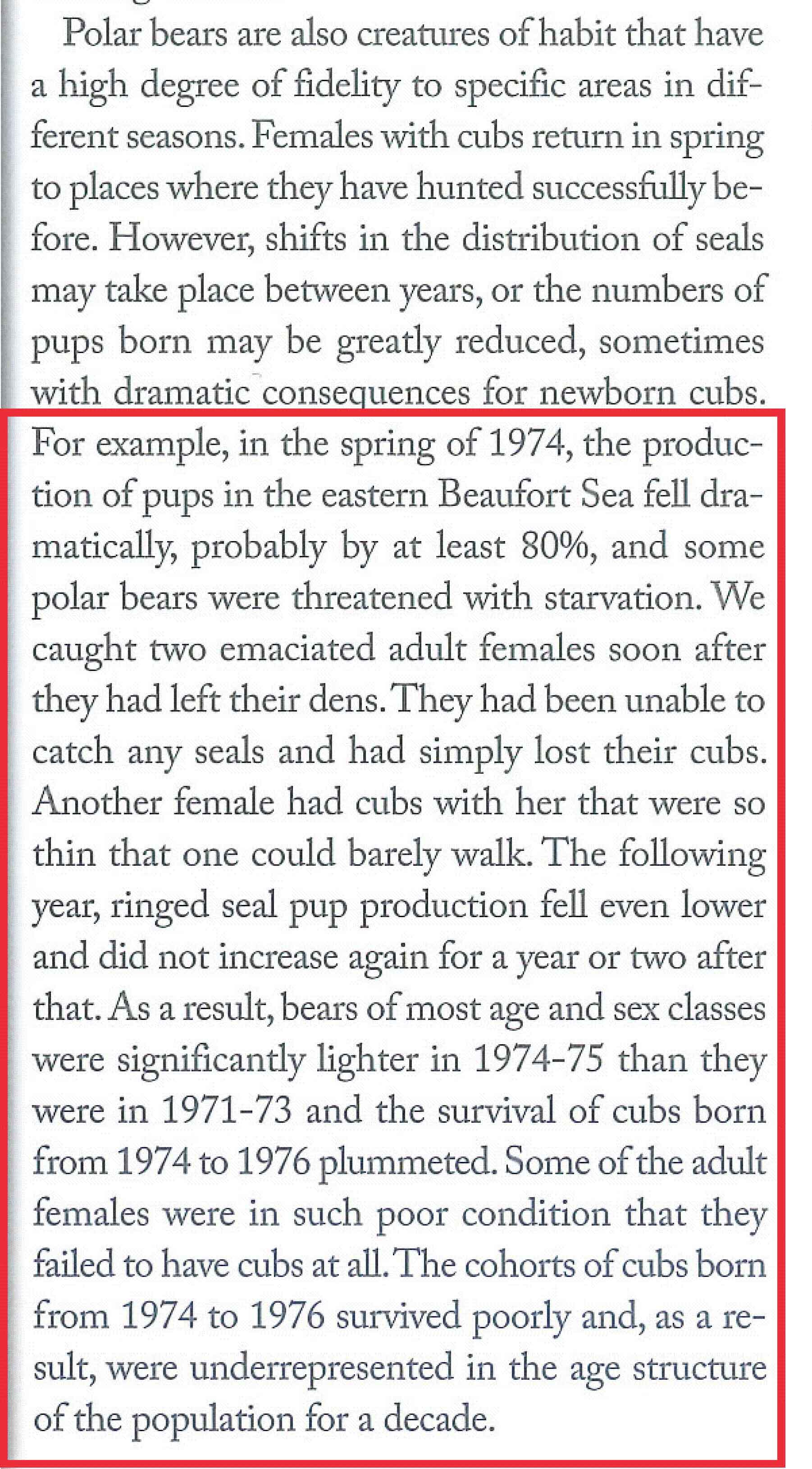 …in the spring of 1974, when ringed seals first became scarce, we captured two very thin lone adult female polar bears that had nursed very recently, from which we deduced they had already lost their litters. A third emaciated female was accompanied by two cubs which were so thin that one could barely walk. We have not seen females with cubs in this condition in the Beaufort Sea, or elsewhere in the Arctic, before or since. Only in 1975 were females with COY [cubs of the year] found in disproportionately high numbers in habitats normally preferred by adult males, apparently in response to the paucity of ringed seal pups in their normal pupping habitat (Stirling et al. 1993). …The environmental factors that cause periods of either high or low productivity of ringed seals in the eastern Beaufort Sea, that last for 3 or more years (Fig. 7.3), are unknown, However, particularly heavy ice in the winters of 1973-74 and 1984-85 coincided with the onset of the decline in productivity of ringed seals, and consequently polar bears, in those decades.