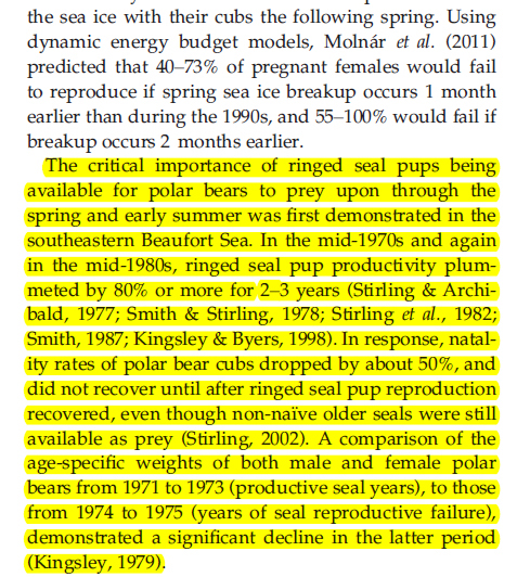 Ringed seals are the primary source of food for polar bears in part because they are usually available close to shore in early spring. Many ringed seals choose this stable ice habitat in which to spend the winter and give birth/mate in the spring (seals mate just after the pups are weaned). Ringed seals are the only seals that establish and maintain these breathing holes in the ice throughout the winter. As a consequence, they are the only prey species easily available to polar bear females who have chosen to den on land or on the shorefast ice close to shore. Fat, newborn ringed seals are an extremely important source of calories for female polar bears emerging from hibernation in the spring with fast-growing new cubs. Of course correlation is not causation but in this case, there are good reasons for supposing that heavy shorefast ice might cause a decline in ringed seal numbers. That’s because there is likely to be a maximum sea ice thickness beyond which keeping breathing holes open becomes impossible for seals. So what do they do if the ice gets too thick? The Beaufort Sea biologists were apparently perplexed at the ‘disappearance’ of ringed seals from the shorefast ice in very cold years. However, observers in Greenland report that in cold winters, when the shorefast ice becomes very thick, the ringed seals simply move out into the pack ice (Vibe 1965:19, 1967). Such flexibility seems not to have occurred to Stirling and colleagues, perhaps because they were convinced that ringed seals do not give birth or mate in the pack ice (more on that issue in a subsequent post). Moving offshore, into the pack ice, makes nearshore seals ‘disappear’ but they are not dead — just somewhere else for a while. So what is the issue with the book and the new paper? Below is what the new Stirling and Derocher paper, entitled “Effects of climate warming on polar bears: a review of the evidence,” in the subsection Why progressively earlier breakup of the sea ice negatively affects persistence of polar bear subpopulations) says about the 1970s mortality event: you tell me if you see a mention of cold or heavy ice.