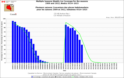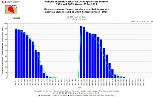 Really? For a book published in 2011? What about 2009, for example? In 2009, the Port of Churchill (on the west shore of Hudson Bay, 580 4’ N 094010’ W), did not open until Aug. 12, three weeks later than the average opening date for the port (July 21) and the latest opening date since 1974. This fact was reported in newspapers around the world at the time. Adding the very late date for 2009 would almost certainly have had more than a minor effect on the downward-sloping trend line on the graph Stirling presents for Hudson Bay breakup dates, which Stirling appears to have generated himself. Such breakup dates for the bay are calculated in a complicated fashion (based on data generated by the Canadian Ice Service, see Scott and Marshall 2010), so the opening date for the Port of Churchill will not be identical. Nevertheless, there is no getting around the fact that ‘breakup’ for Hudson Bay was exceedingly late in 2009. [I’ve looked for an updated version of Hudson Bay breakup dates that include 2009 (even contacting authors of previous reports) but it seems that no one has yet calculated this value.] Stirling does bring up the ice conditions of 2009 in his climate chapter, but only in relation to the late date of freezeup that fall — he leaves out of his discussion any mention of the very late breakup phenomenon earlier in the year.