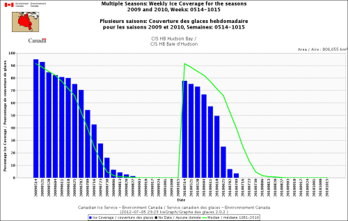 I just discovered the Canadian Ice Service page for generating graphs of data from their archive, http://dynaweb.cis.ec.gc.ca/IceGraph20/page1w.jsf Using that, I was able to compare 2009 to several other years.