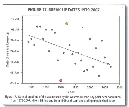 The second example is the discussion of break-up dates for Hudson Bay, which are used by Stirling in his climate warming chapter to make a case for correlating declines in polar bear numbers, and their physical condition, with declines in sea ice and increased temperature. Hudson Bay freezes and thaws completely every year: the bay begins the freezing process in the fall (called ‘freezeup’) and melts completely by the end of summer (called ‘breakup’). The graph of breakup dates Stirling provides (Fig. 17, pg. 284) ends in 2007 (see below).