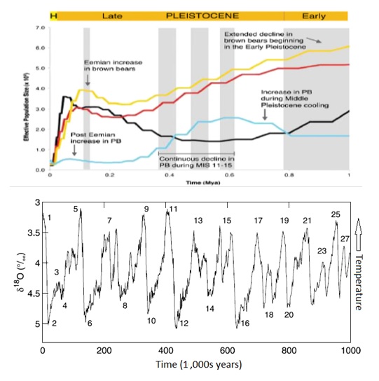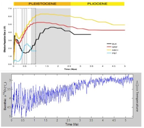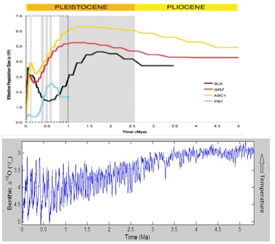 Figure 1 (top): Estimates of the effective population size over the past 5 million years of the different bear species studied; BLK—black bears, GRZ—brown bears, ABC1—a different kind of brown bear, PB7—polar bears (source: Miller et al., 2012). Figure 1 (bottom): General climate history of the earth for the past 5 million years as derived from a collection of ocean sediments (source: Lisiecki and Raymo, 2005).