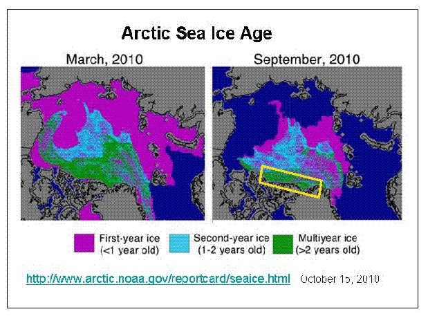 Figure A. Arctic sea ice age (and relative thickness) for 2010, maximum in March, minimum in April. Yellow box marks the area of persistent multiyear ice (patches coloured green) north of the Queen Elizabeth Islands, Ellesmere Island and NW Greenland that likely survived even in warm interglacials.