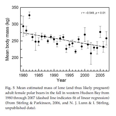 Derocher, A.E. and Stirling, I. 1995. Temporal variation in reproduction and body mass of polar bears in western Hudson Bay. Canadian Journal of Zoology 73:1657-1665. http://www.nrcresearchpress.com/doi/abs/10.1139/z95-197