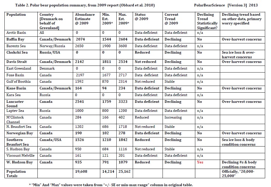 ![Table 2. A simple summary of the data presented in the 2009 report status table (Obbard et al. 2010). Totals and country/countries which manage each subpopulation have been added, future predictions are not included. Not all subpopulation estimates are of equal quality – some are based on aerial surveys or mark-recapture data while others are not. Also, both the “status @ 2009” and “Current trend @2009” columns are subjective assessments (opinions) made by PBSG biologists. The “Min” and “Max” estimates come from the error estimates provided for subpopulation that have aerial surveys or mark-recapture data (“estimate +/- SE or 95% CI”) or, for others, the “min/max range” provided (this varies by population). I only included reasons for a declining trend that was included in the original table. See Fig. 1 below for a map of the subpopulations. Click to enlarge. [this is Version 3 ]](https://polarbearscience.com/wp-content/uploads/2012/10/pb-pop-summary-2009-table-2-version-3.jpg?w=500&h=346)