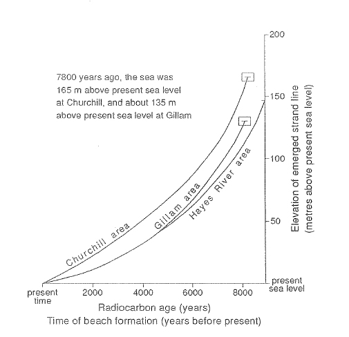 Figure 4. After the ice had melted about 7,800 years ago, the shore of Hudson Bay was still depressed due to the weight of the Laurentide Ice Sheet. It has been slowly rebounding since then. As this graph shows, Churchill (on the west coast of Hudson Bay) would have been 165m under water 7,800 years ago and the Hudson Bay shoreline would have been well inland from its present position. By 2,000 years ago, sea level would have been about 25m above present levels and the shoreline perhaps several kilometers inland from its present position. This means that coastal sites once occupied by ancient people – and any maternity dens of polar bears – will be found inland from the present coast. Graph from Dregde (1992:11).