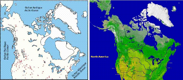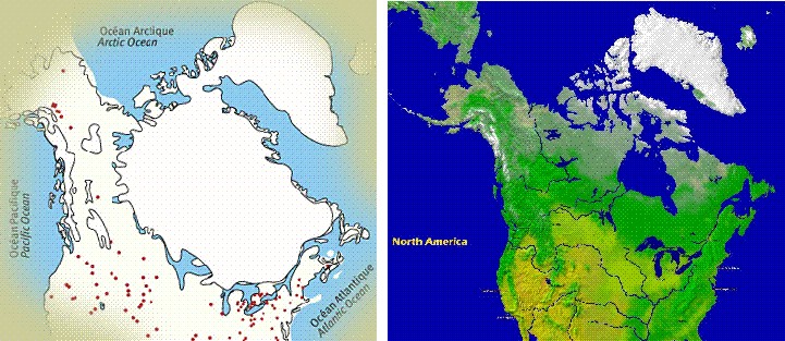 Figure 2. By 11,500 years ago (after the so-called “Younger Dryas” cold period had ended), central Canada and many of the Canadian Arctic Islands were still covered by ice year round (left). Modern configuration, on right, shown for comparison. Map on left from the Canadian Museum of Civilization (R. Morlan), map on right from “top 1000 destinations.”
