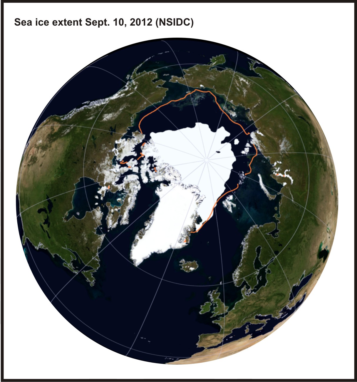 Fig.3. Compare the summer sea ice extent shown here (at Sept. 10, 2012, close to the annual minimum) to the total range of polar bears in Fig. 2. Click to enlarge.