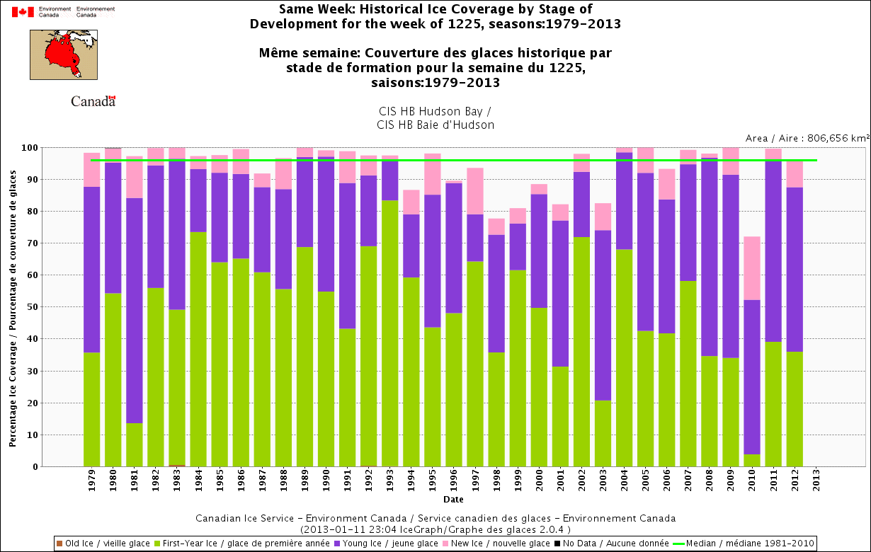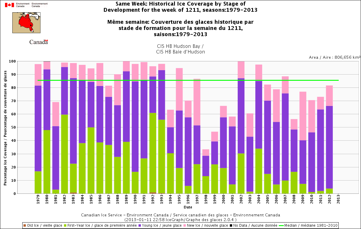 Lyne Morissette is right to say that killer whales should not be in Hudson Bay at this time of year but she is wrong to say their plight is a consequence of global warming (and so is Peter Ewins of the World Wildlife Fund, quoted here). The killer whales got trapped because the sea ice formed in northern and western part of the Bay before it froze in the east – as it has done for more than 30 years – and they simply stayed too long. The sea ice charts for Hudson Bay tell us that the ice extent for early January 2013 is above normal, not below, and the sequence of ice formation this winter has been quite normal.