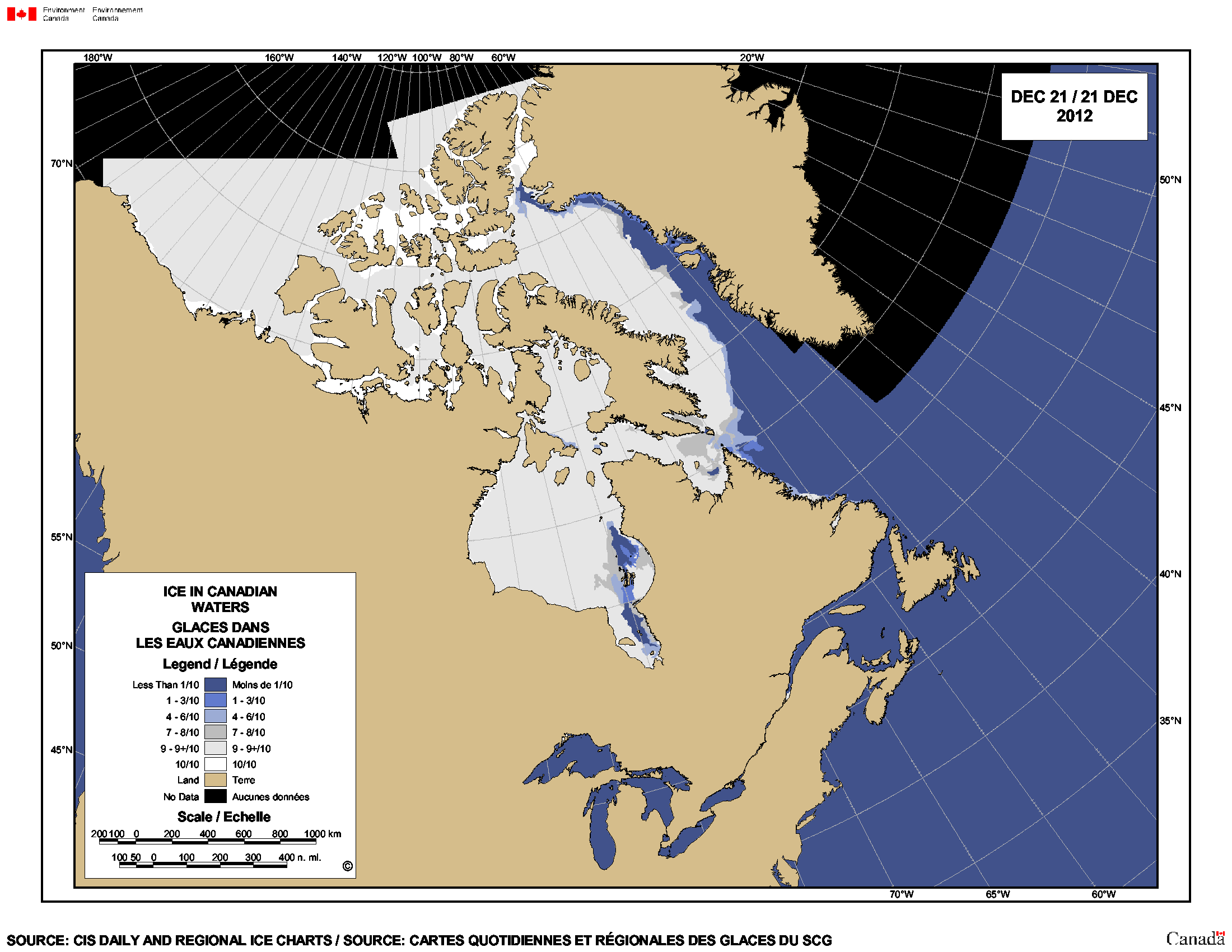 The problem – for killer whales – is that sea ice tends to form in northern and western Hudson Bay first and thicken there faster (see maps below, from November 30, 2012 (Fig. 4) and December 21, 2012 (Fig. 5), potentially closing off the narrow “neck” of the bay and their escape route to open water. This is the normal sequence and timing of freeze-up (Gagnon and Gough 2005).