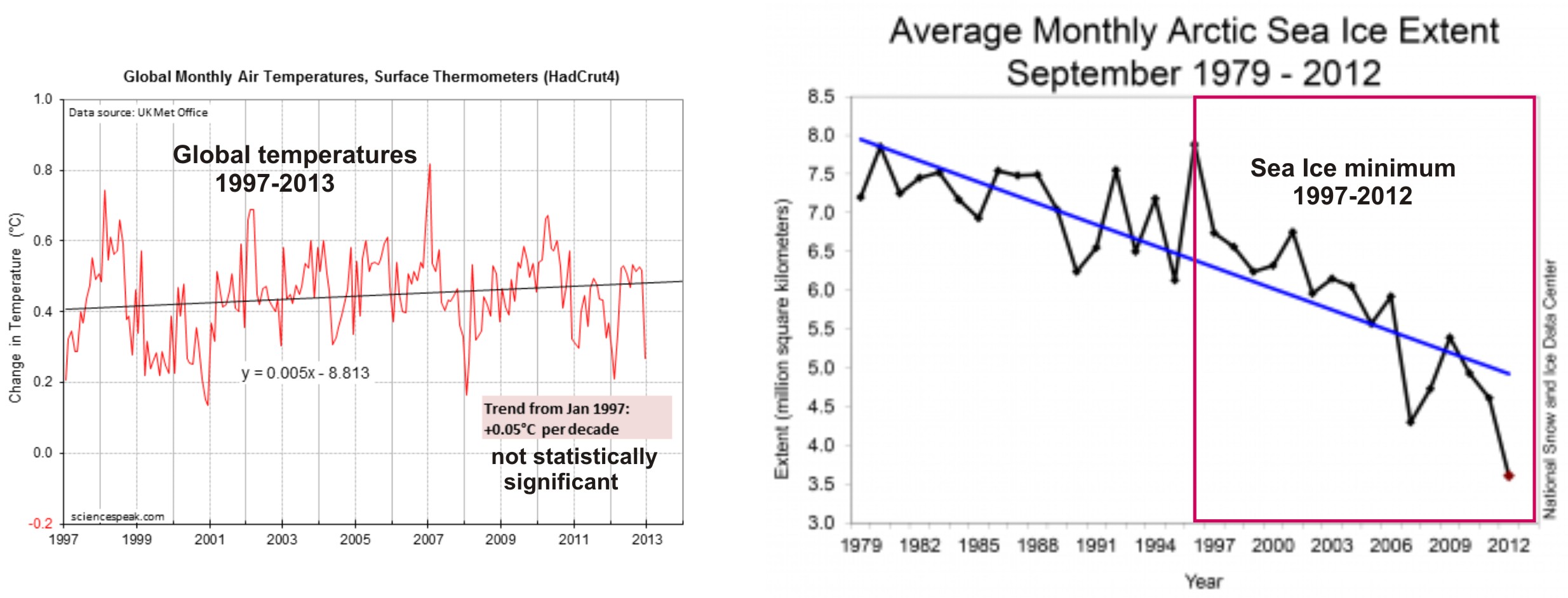 Figure 2. LEFT – There has not been any statistically significant increase in global temperatures over the last 16 years (1997-2013), even though CO2 levels have continued to rise (Graph modified from David Evans, using Hadley UK Met Office data (HadCrut4). RIGHT – Sea ice extent in September (the yearly minimum) has declined quite a bit since 1997 – although nowhere near zero – while global temperatures have barely changed overall (Graph from NSIDC) Click to enlarge.