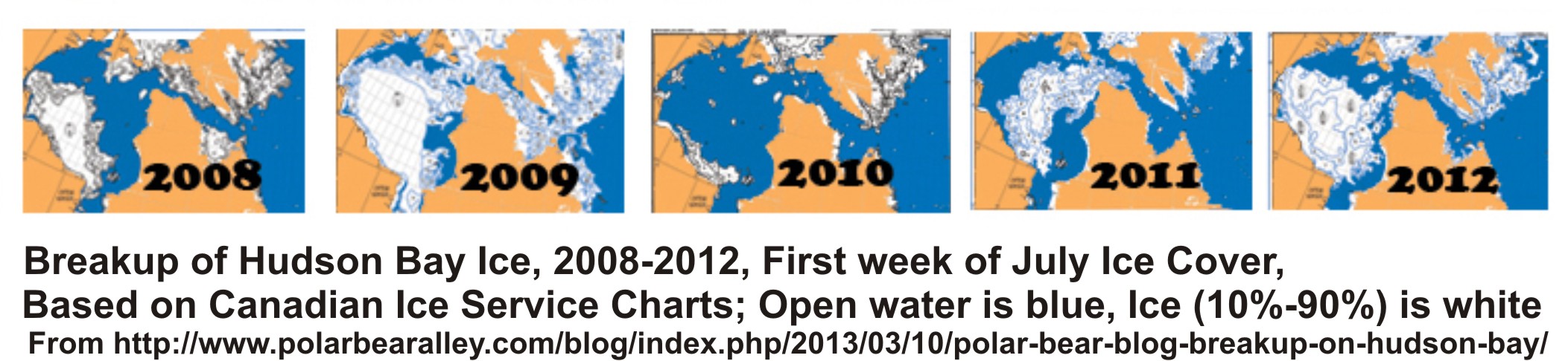 [note that recent breakup dates used by polar bear biologists (2008-2012) for Hudson Bay have not been calculated or published. However, the opening of the Port of Churchill, in western Hudson Bay, is a rough proxy for “ice-free” water because ice on the Bay must be virtually gone before shipping can begin. Opening dates for 2007 and 2009-2012, are: 2007, July, 25 (long-term average opening date); [2008 not available]; 2009, Aug. 12 (latest on record); 2010, July 29; 2011, Aug. 3; 2012, July 15 (only 10 days earlier than average) – in other words, no steady precipitous decline in recent years. For another perspective, see the ice chart summaries for the first week of July, 2008-2012 (below), cropped from Kelsey Eliasson’s graphic of Hudson Bay ice breakup over the period 1971-2012 at Polarbearalley.]