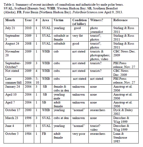 4. For details of other recent incidents, see Table 1 below. Table 2 is from Taylor et al. (1985), which describes the known incidents of cannibalism, infanticide and intraspecific aggression to that date (apologies for the poor quality). It is clear from Taylor et al.’s list that cannibalism has taken place relatively often in the past – in spring, summer and fall – long before ‘global warming’ reared its ugly head as a potential scapegoat.