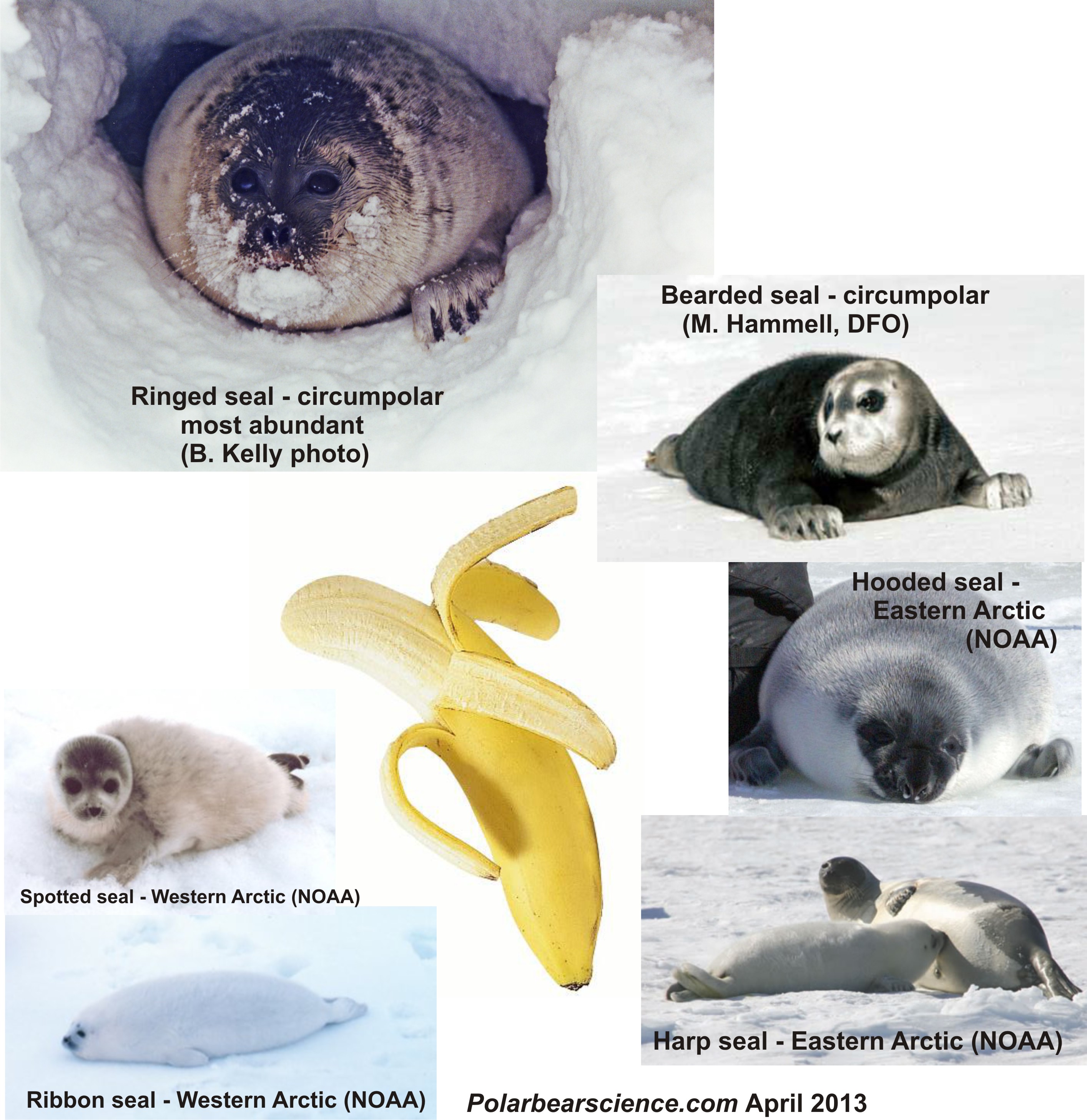 Figure 1. The ice seal species consumed by polar bears, pictured at or close to weaning age when they may be 50% fat by weight. Ringed seals are consumed the most often, with bearded seals the second – other species are consumed if encountered but they are much less common and occur only in particular areas. The banana is a reminder that polar bears usually eat the fat of seals first, pealing the skin off the body and consuming the underlying fat. When seals are abundant, adult bears may not eat any more than the fat, leaving behind the carcasses – which are then available for younger bears and arctic foxes.