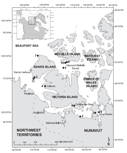 Figure 2. This map is Fig. 1 from the Doupé et al. (2007) paper. It shows the locations of “selected examples of grizzly bear sightings in the southern Canadian Arctic Archipelago,” up to and including the hybrid shot in 2006. Original location notes:1. Schwatka (1885) interprets the “unusual animals” sighted by Inuit in the Simpson Strait area as grizzly bears; 2) 1938: pair of grizzlies observed on the sea ice 24 m west of Perry River; 3)1951: hunter kills grizzly bear in Masik River valley, Banks Island; 4) 1986: one bear shot, another suspected in Holman; 5) 1991: bear tranquillized and examined on sea ice, 60 km south of Melville Island; 6) 1996-2002: five kill records in Gjoa Haven; 7) five-year-old male grizzly harvested around Gore Islands; 8) 2001:bear denned within 20 km of Cambridge Bay; 9) 2003: most northerly sighting of a grizzly bear in Canada, Cape Clarendon (this study); 10) 2004: tracks observed , DNA obtained, Cape Providence (this study); 11) 2006: grizzly-polar bear hybrid killed, Nelson Head. The paper is available free of charge (here).