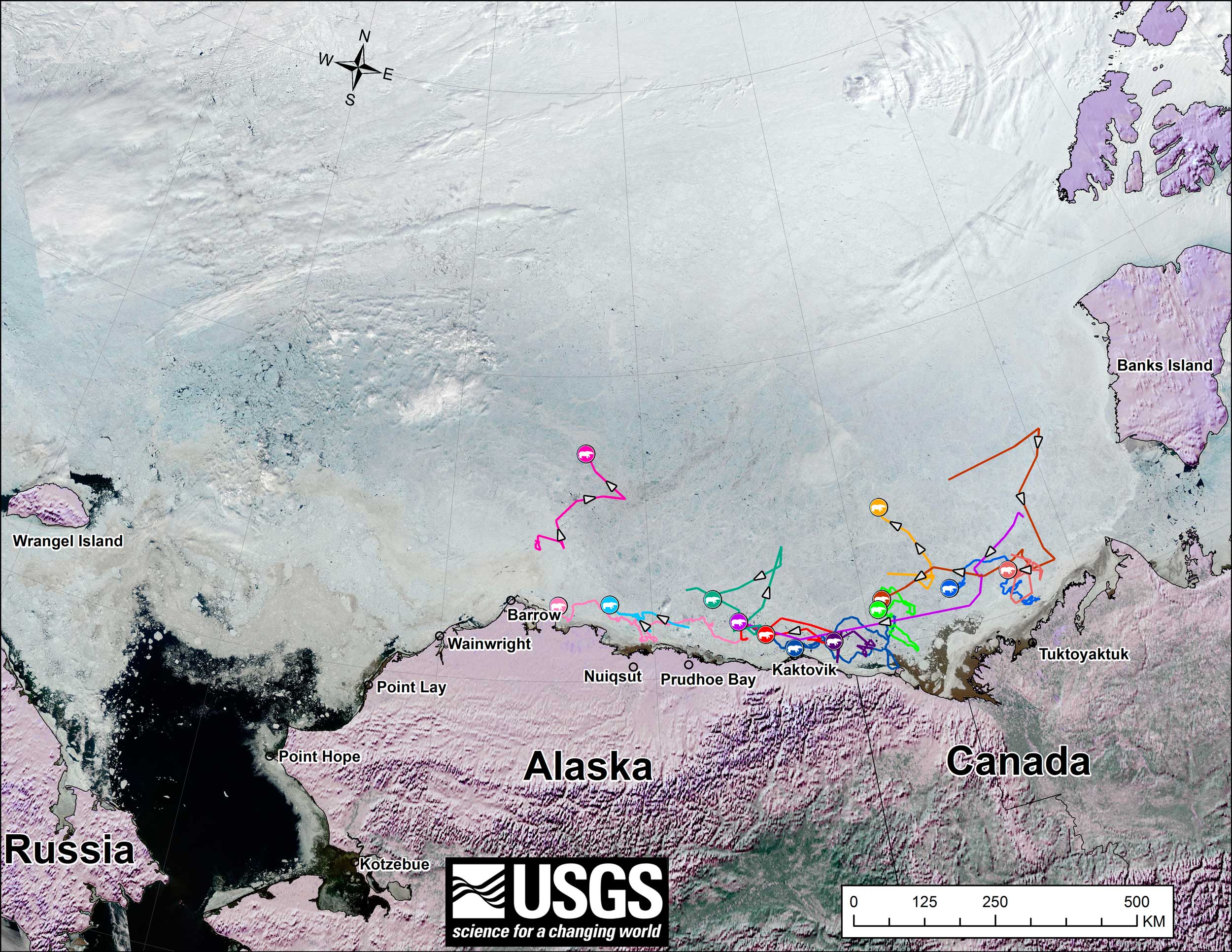 Keep in mind that when the ice is moving (retreating away from the coast in summer, advancing toward the shore in fall), some of the onshore/offshore movement of the tracks over the course of the month may reflect the bears attempting to stay with the ice edge as it moves.
