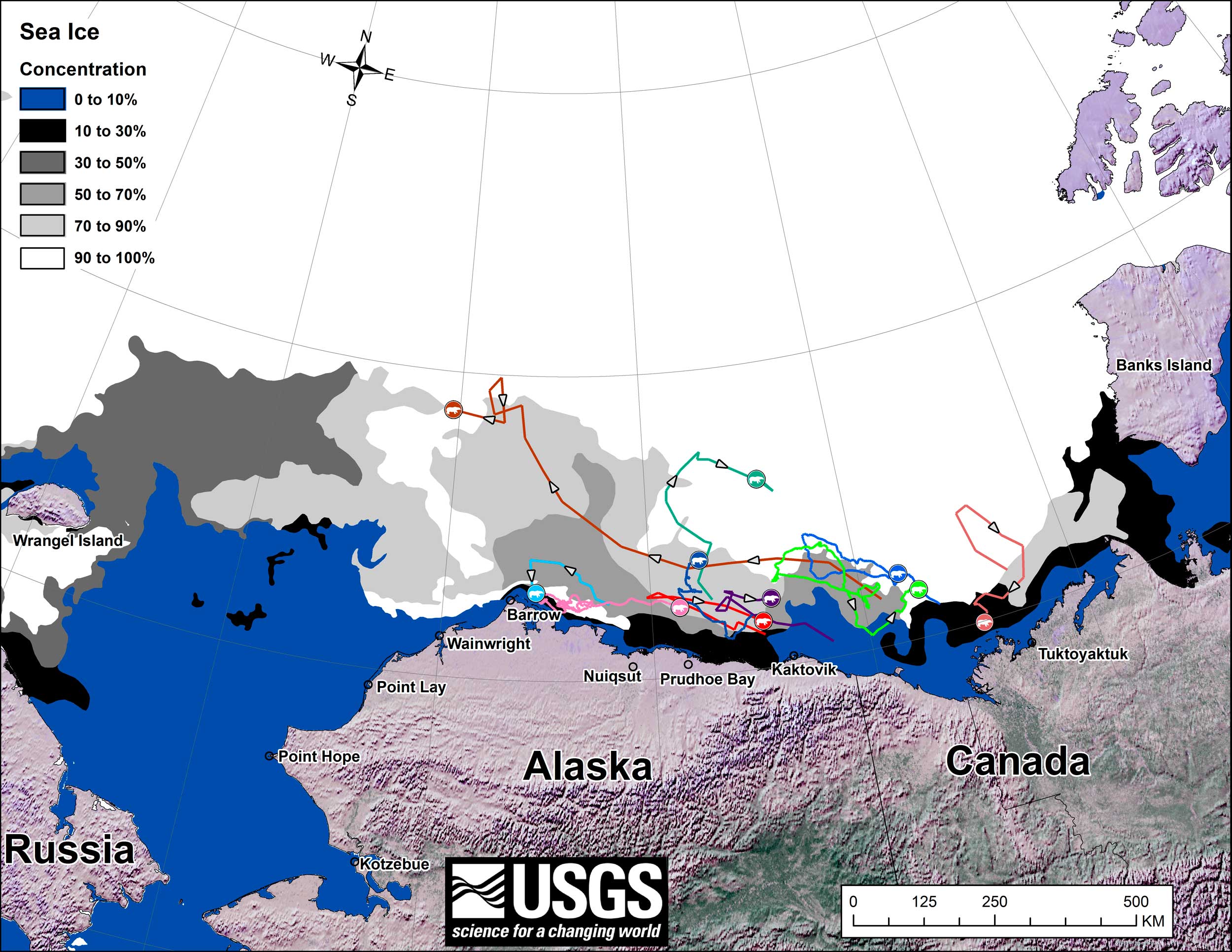 Figure 2. Movements of 10 satellite-tagged polar bears for the month of July, 2013. Polar bears were tagged in 2013 on the spring-time sea ice of the southern Beaufort Sea. All 10 of these bears have satellite collar transmitters. Polar bear satellite telemetry data are shown with Ice Analysis charts from 29 July, 2013. Ice Analysis charts are made available by the National Ice Center. The land cover is made available by Natural Earth [this is the original caption]. Click to enlarge.