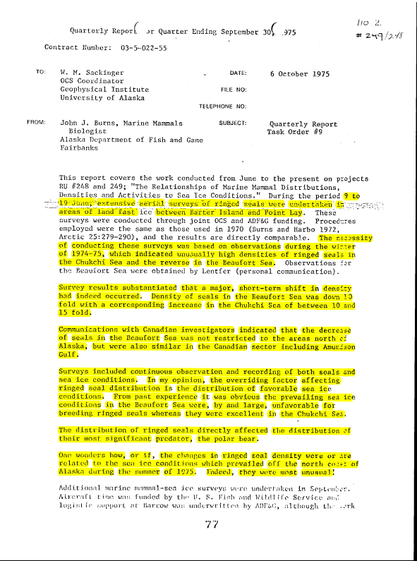 Seal biologist John Burns described the unusual nature of the movements of seals and bears in his quarterly report on research he was doing on the distribution and abundance of seals (Burns and Fay 1975). I’ve copied the first page below, in which he says (in part):