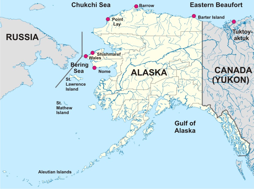 The report on this incident was made by biologist Jack Lentfer in his summary of polar bear research in Alaska for the IUCN Polar Bear Specialist Group’s 6th meeting (1976, pg. 187 and 192, “Polar bear management and research in Alaska 1974-76”). See the map above for locations of communities mentioned (click to enlarge):