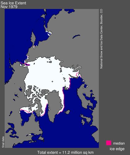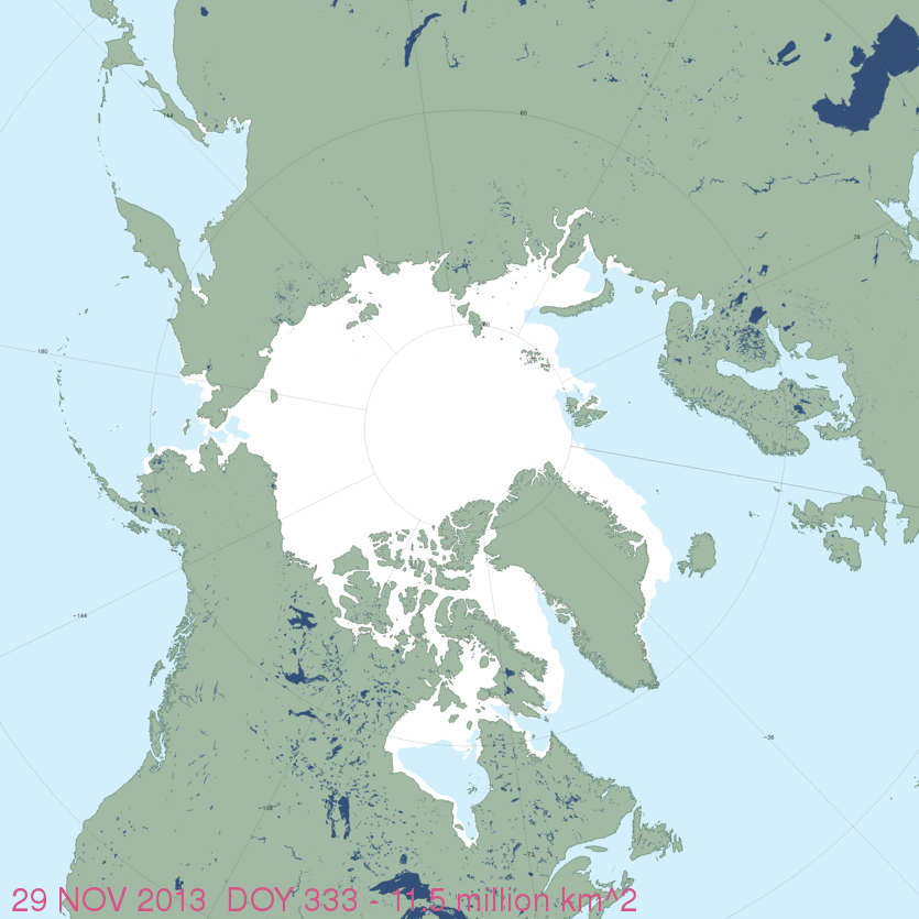Below are the US National Snow and Ice Data Center (NSIDC) ice extent maps for November 29 2013 and for the end of November 1979 – the start of the satellite sea ice mapping record (more archived maps):