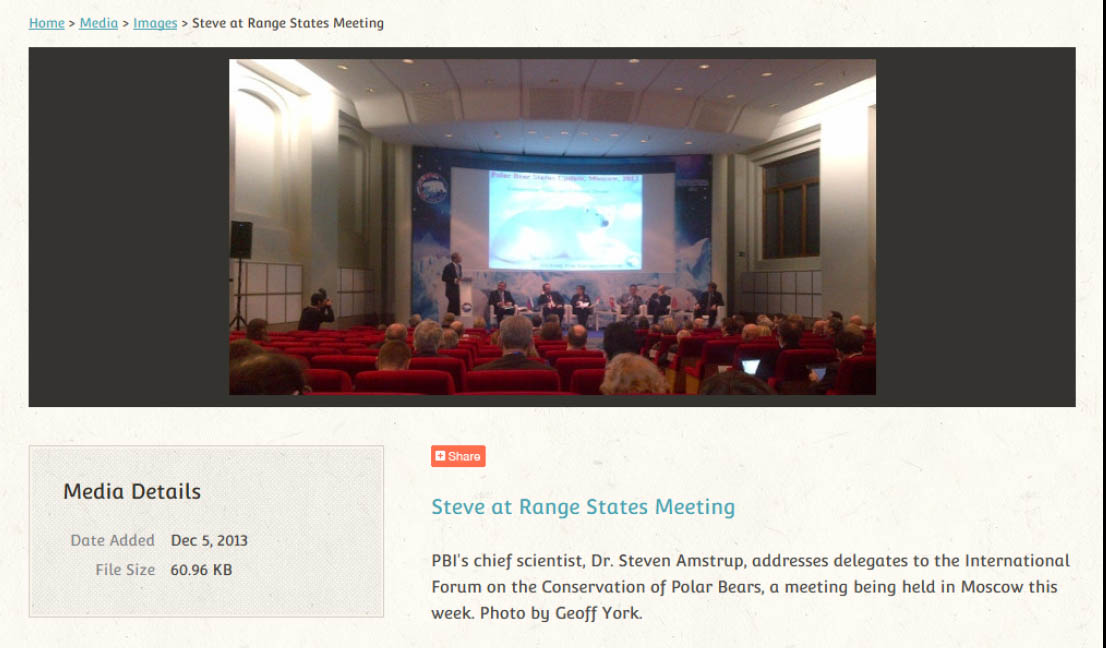 Screencap of the photo details posted on the Polar Bears International website Dec. 5 2013. The photo was taken by WWF representative Geoff York, who should not been attending this portion of the meeting. Did officials let him pop in to take the photo or was he allowed to participate in the entire day’s proceedings, using his new Polar Bear Specialist Group credentials?