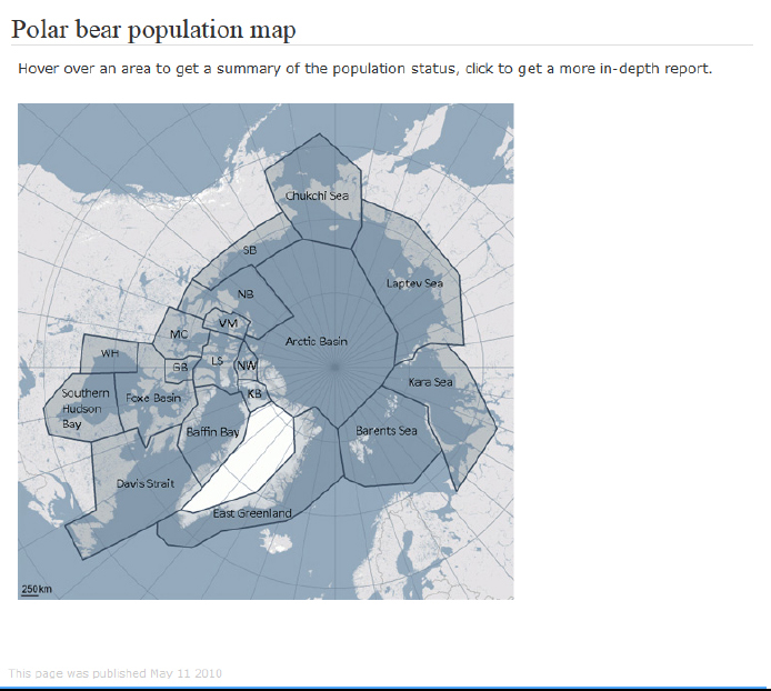 That confusing “State of the Polar Bear” graphic has been replaced by the map below, click to enlarge, which was not present before. The original has pop-up notes on the status and population estimate that appear when you pass your mouse over a region, but those don’t copy. This map was not present all through January either, yet it’s time stamp also says May 11, 2010.