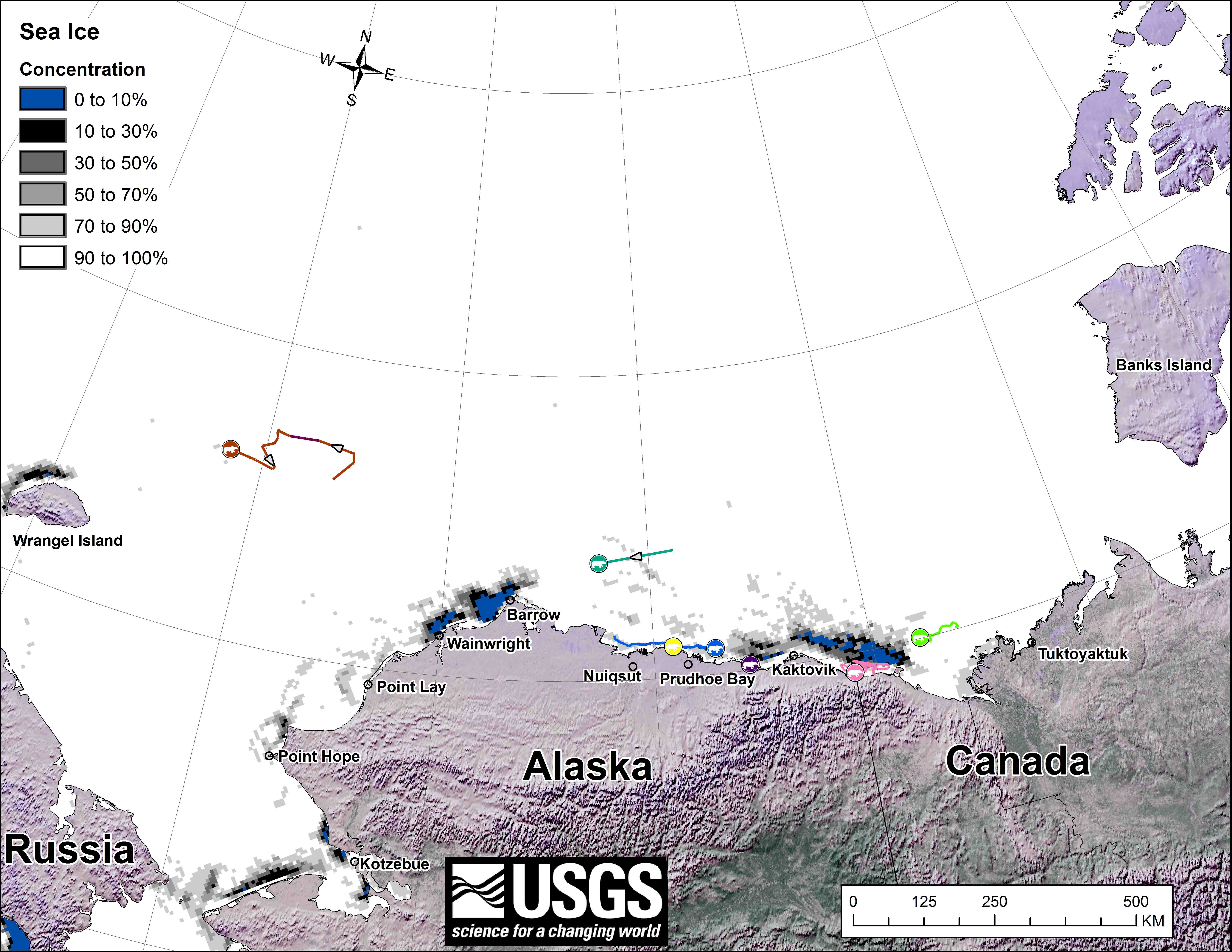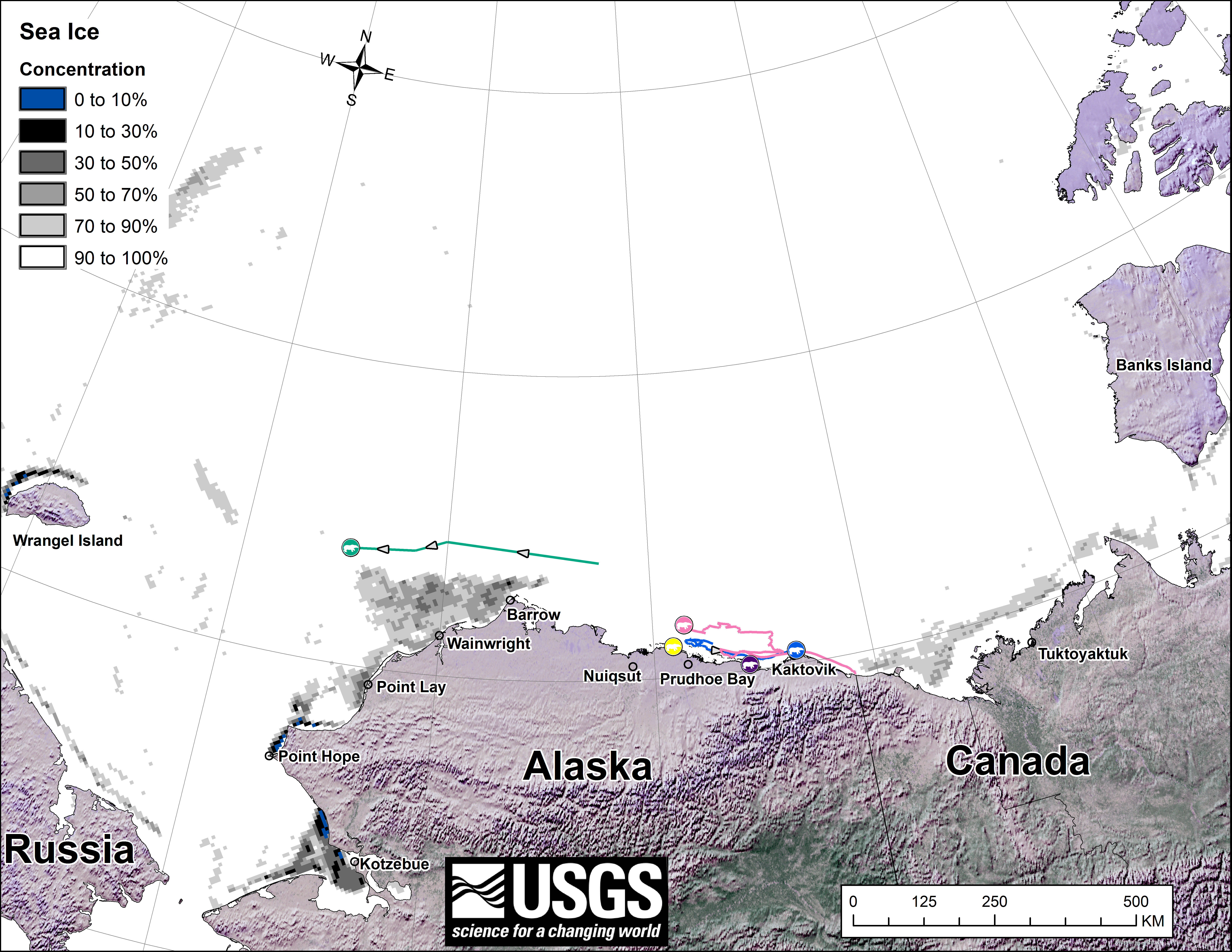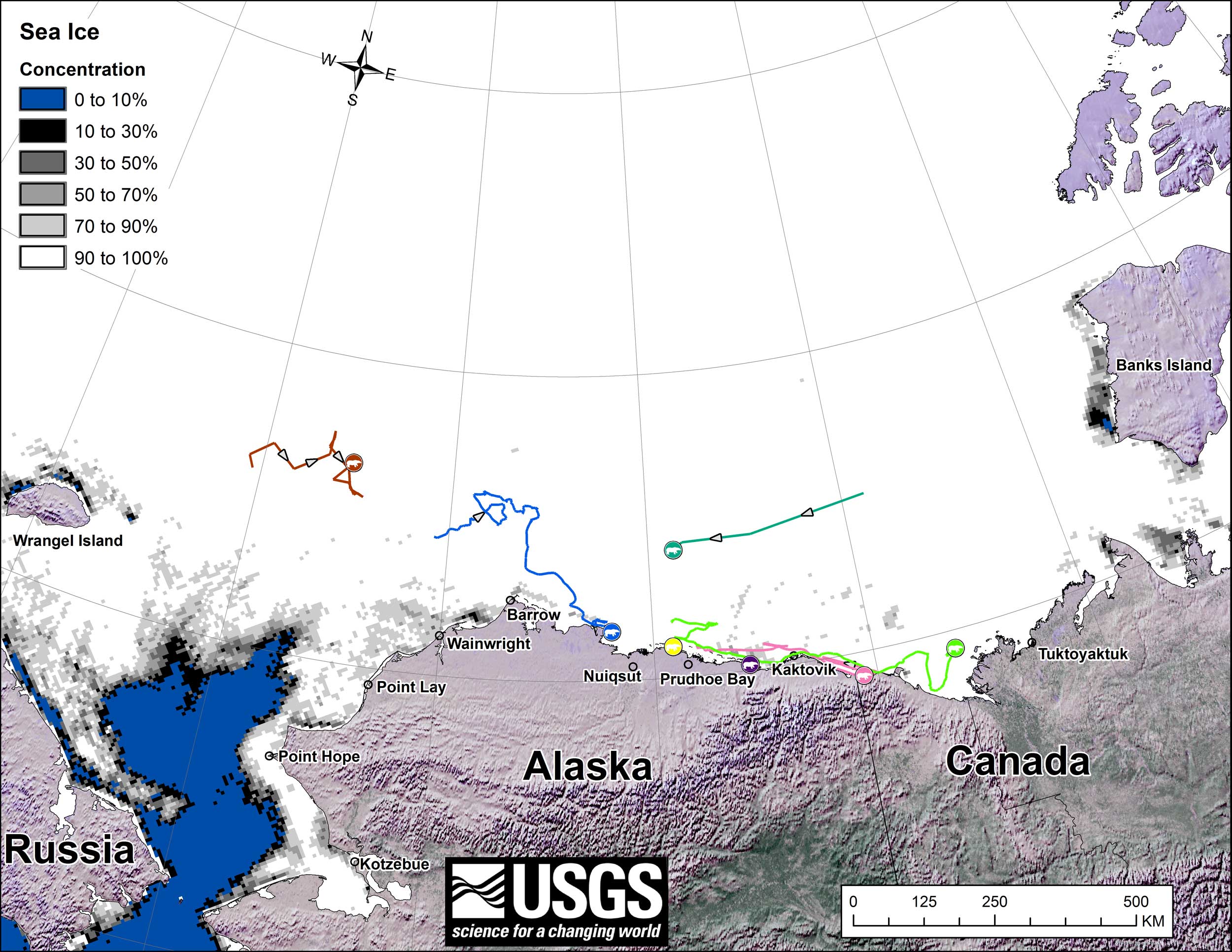 The female with the dark brown track has moved out of the region — or her collar has stopped transmitting. She was in the Southern Beaufort in early October, moved west to the Chukchi that month, and stayed in the Chukchi during November and December. Maybe she’s still there with a broken transmitter.