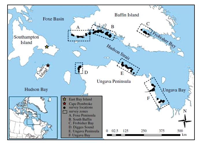 Figure 1. From Iverson et al. 2014 (their Fig.1), “map of the study area.” Most of the study sites are within the Foxe Basin polar bear subpopulation region (see Fig. 2 below), although the Ungava Peninsula (E), Ungava Bay (F) and Frobisher Bay (C) sites are in the Davis Strait subpopulation.
