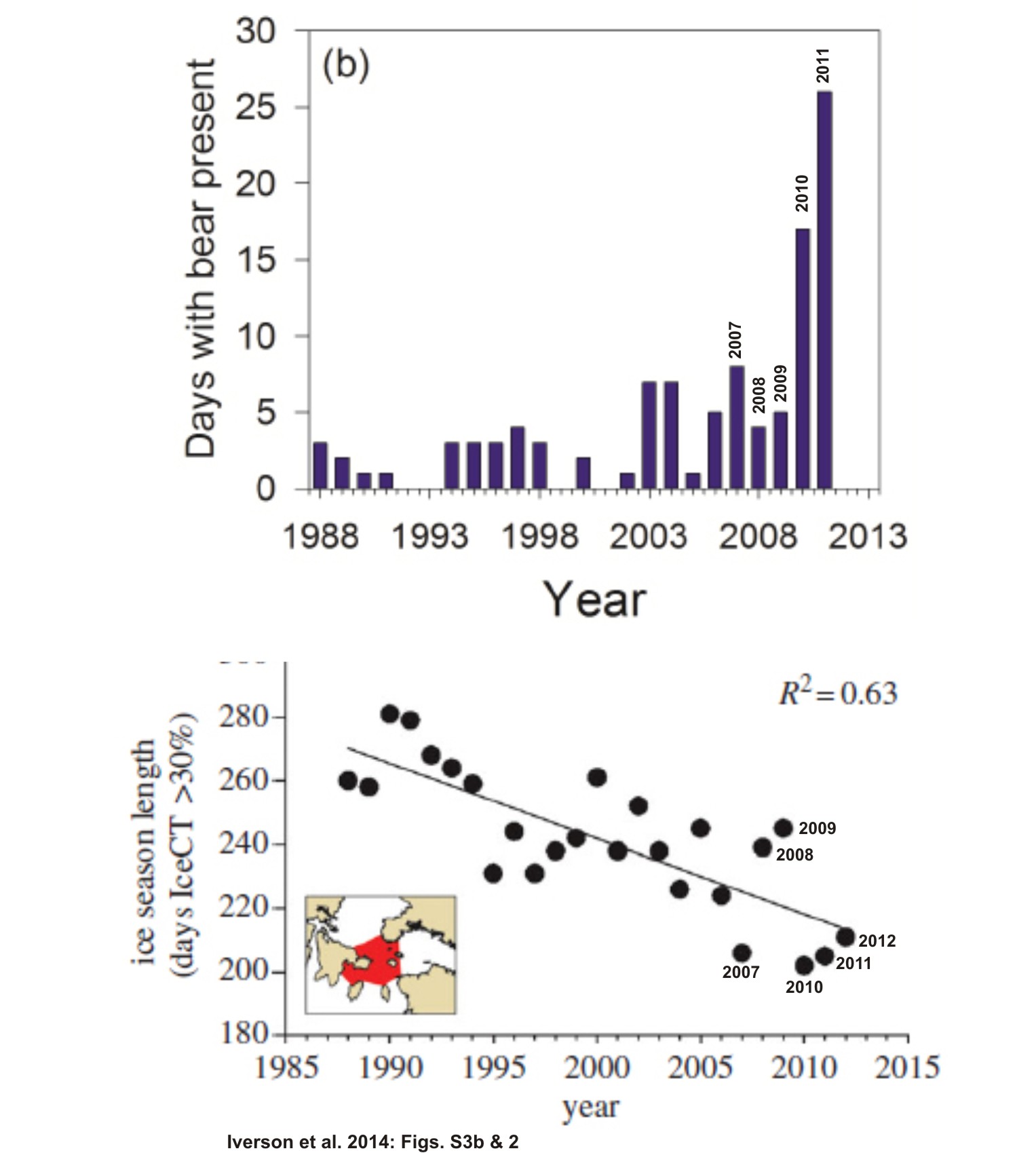 ![Figure 3. Two graphs from Iverson et al. 2014. Top (their supplemental Fig. S3a): “the number of days on which one or more polar bears was sighted at the East Bay Island,” eider colony, from 1997-2012. That could be the same bear sighted every day over that period or several sighted on multiple days. Bottom (their Fig. 2): “decline in annual sea ice coverage in Northern Hudson Bay Narrows” for 1988-2012 (days with >30% ice). While there is a trend in both data sets, note the lack of a consistent correlation between length of ice season (bottom) and polar bear presence (top) year-to-year, especially for 2009 vs 2011 and 2005 vs 2001. [this is the corrected version]](https://polarbearscience.com/wp-content/uploads/2014/02/iverson-et-al-2014-east-bay-sea-ice-graphs-combined_feb-11-2014-corrected.jpg?w=500&h=557)