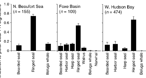 Thiemann and colleagues (2008) found that Foxe Basin bears they sampled ate the largest proportion of walrus (~7% of their total diet, highest amongst adult males). They also had a more varied diet than some other subpopulations, although ringed seals still made up the bulk of their diet (Fig. 5.). Variety may be the key, as some prey may be more abundant at certain times of the year.