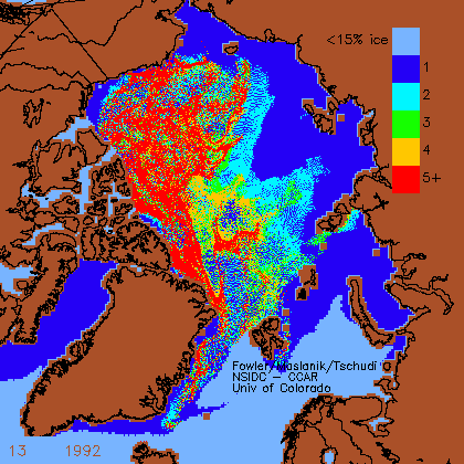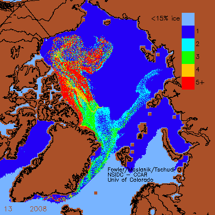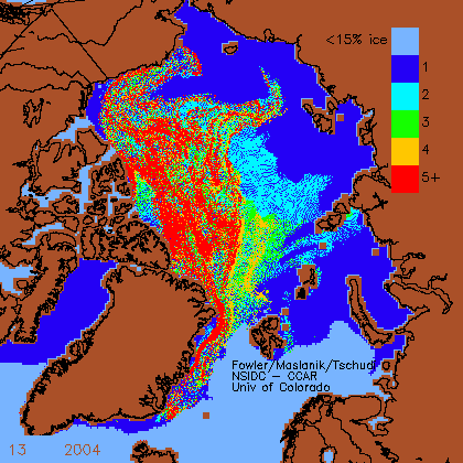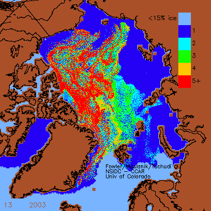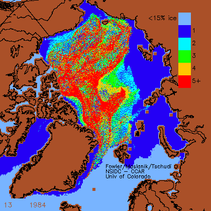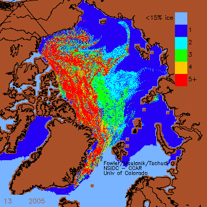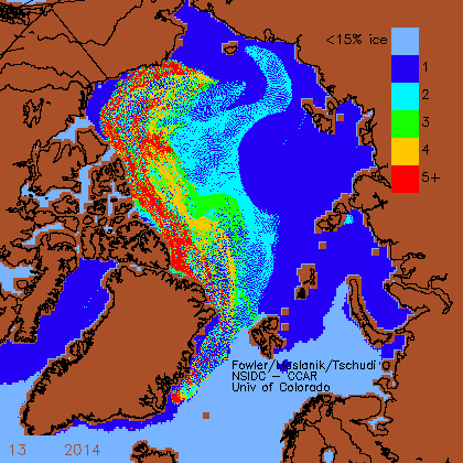 I’ve used Week 13, noted in the lower left of each chart (the latest available for this year at NSIDC), which is usually the last week of March. The ice is mapped by age: first year ice that’s formed this year, 2 year old ice (survived the last summer’s melt), and so on up to “5+” (which is very thick multiyear ice that has survived five or more summer melt seasons). The year of the chart is beside the week indicator, toward the middle.