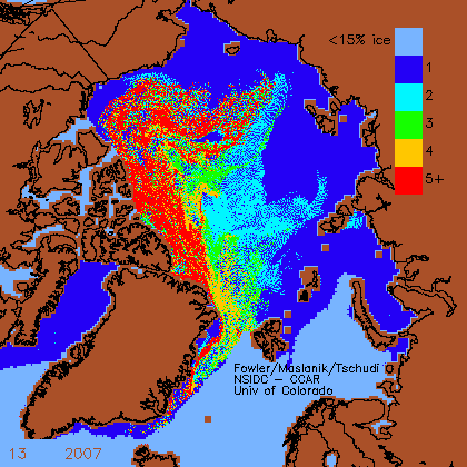 Below are archived ice age charts from the US National Snow and Ice Data Center (NSIDC) for some previous years when Beaufort bears had trouble, especially 2004-2006, with which I compare this year’s conditions. [h/t Steve Goddard for alerting me to this resource]