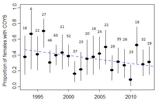 From their preliminary research on “Proportion of females with cubs” from 1993 to 2013 (reposted here as Figure 1, below) it turns out that two years (1994 and 1996) of high cub production in the mid-1990s pushed the average for that decade to about half of females having new cubs – otherwise, the average would have been closer to 40%.