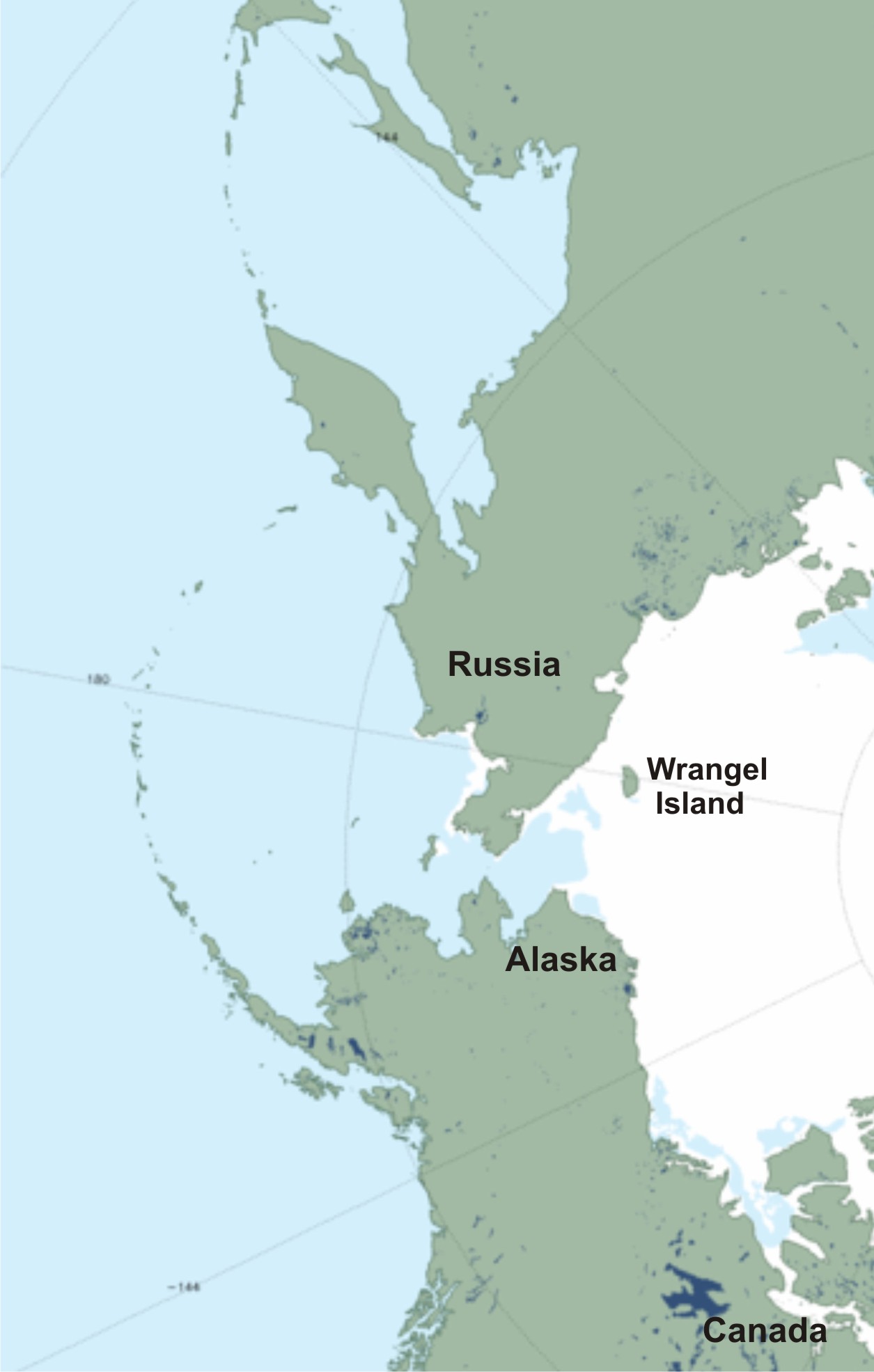 Figure 4. NSIDC sea ice extent at June 21, 2014 (a “MASIE” product), close-up of the Bering, Chukchi and Beaufort Seas, labels added. Note there is still ice around Wrangel Island (an important polar bear denning area) and lots of ice off the coast of Alaska. Bears in this area of the Arctic generally stay on the ice as it retreats – only a small percentage of bears spend the ice-free period on land. Click to enlarge.