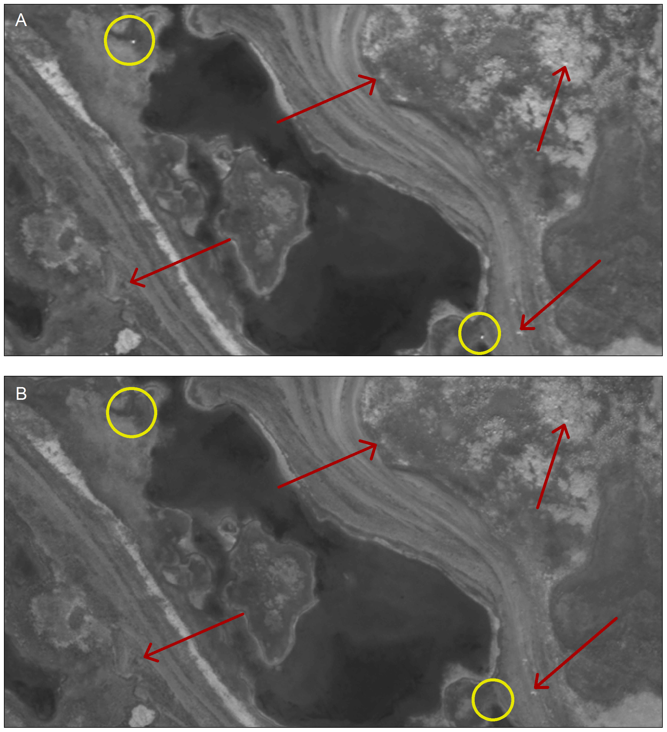 Figure 2. This is what adult polar bears on an island, in summer, look like from space (upper image (a), in yellow circles). Red arrows point to rocks and other features in the landscape. Cubs are generally too small to see. This is Fig. 2 from Stapleton et al. 2014: the lower image (b) is a reference shot without bears, so the presence of white dots in the “target” image (a) are inferred to be polar bears (yellow circles).