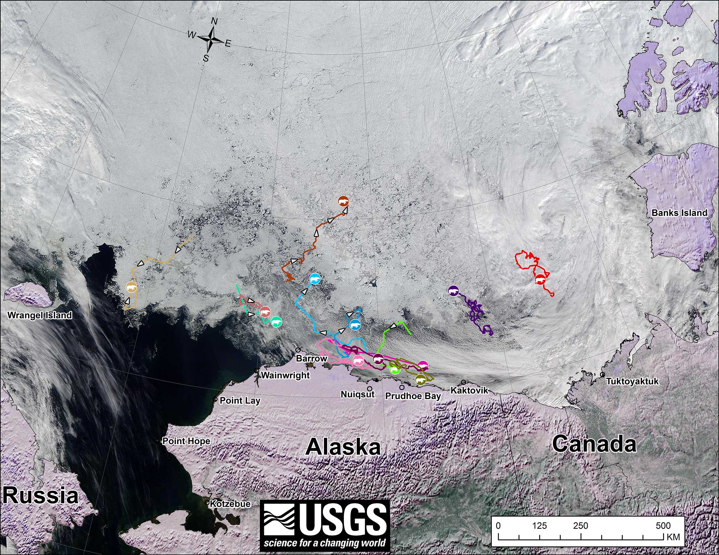 One bear has moved into Canadian territory and another is well into the Chukchi Sea. This is now known to be a typical rather than unusual phenomenon, and is pertinent to the bigger picture of what constitutes a discrete geographic subpopulation for polar bears.