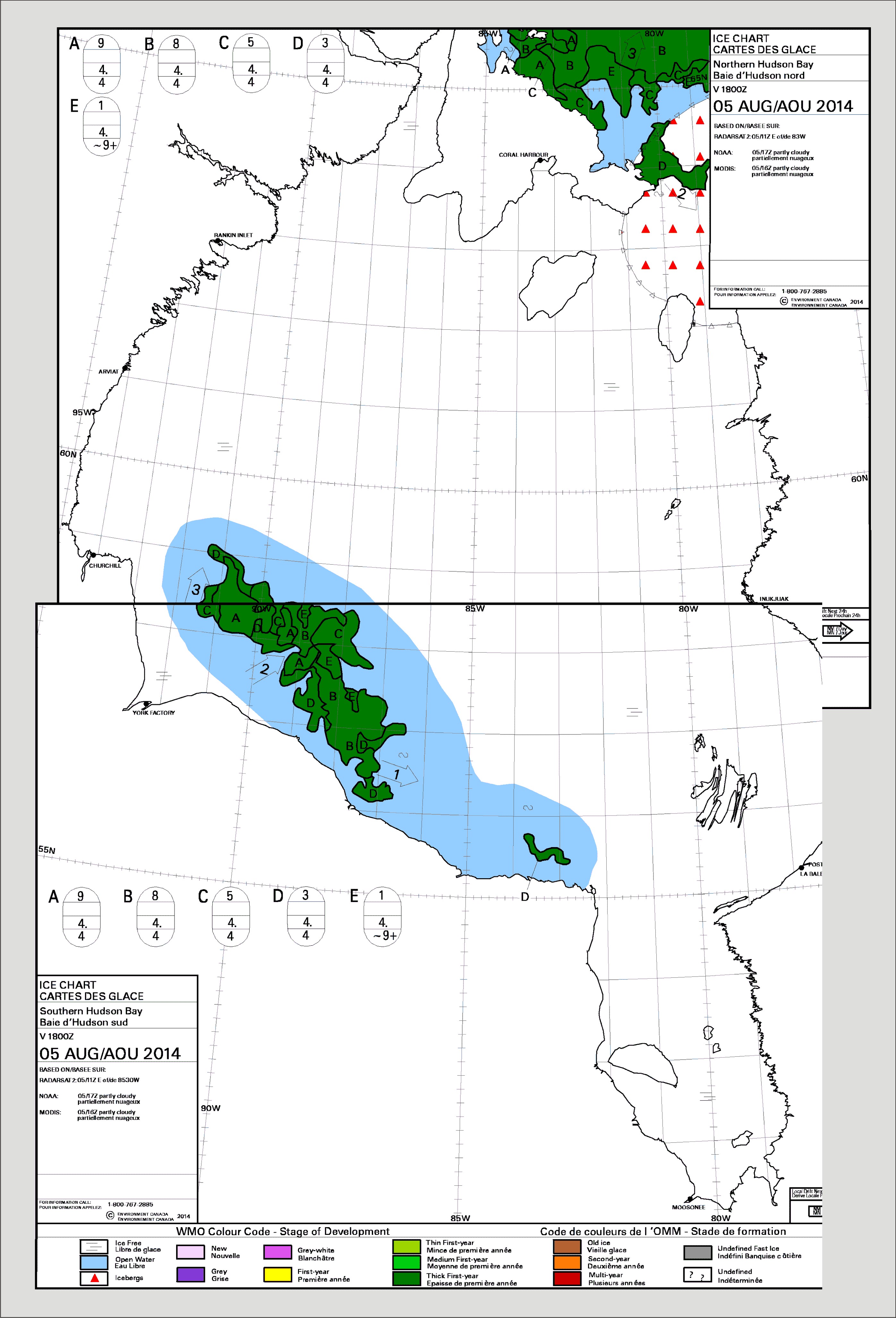 Figure 3. Ice chart by age of ice in Hudson Bay (composite of “South” and “North” HB charts), showing extent of thick first year ice at August 5, 2014. Canadian Ice Service.