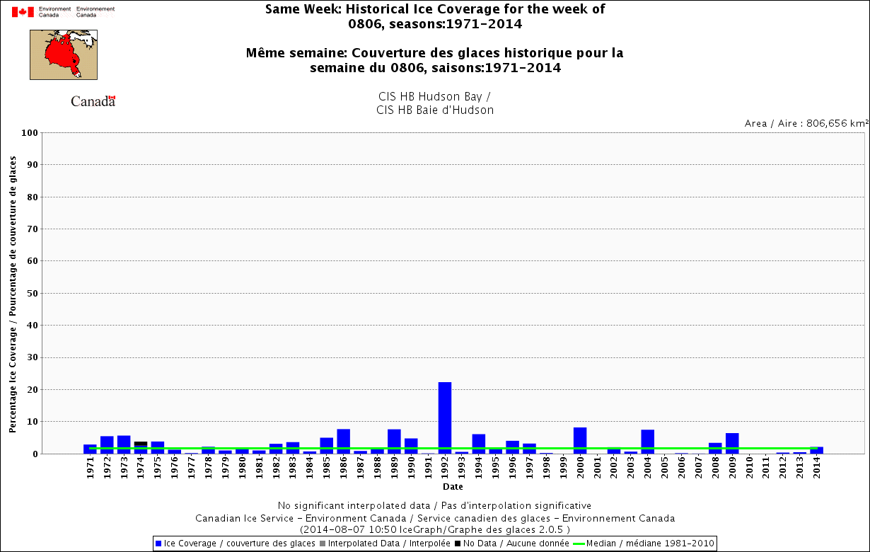 Figure 4. Historical ice coverage for the week of August 6, 1971-2014 for Hudson Bay, showing just above average and the highest since 2009. Ice in 2009 (6th bar from the right) was late breaking up, while 1992 had the highest coverage for this date in the entire record. Canadian Ice Service graph. Click to enlarge.