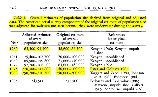 Walrus numbers are up considerably from the 1960s, although they are notoriously difficult to count (Garlich-Miller et al. 2011).