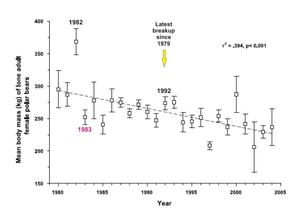 The authors of that study (polar bear specialist Ian Stirling and NASA sea ice researcher Claire Parkinson) reported the body weights of lone female bears captured in Western Hudson Bay between 1980 and 2004. The trend over time in those bear weights was then correlated with the overall change in dates of sea ice breakup on Hudson Bay for that period.