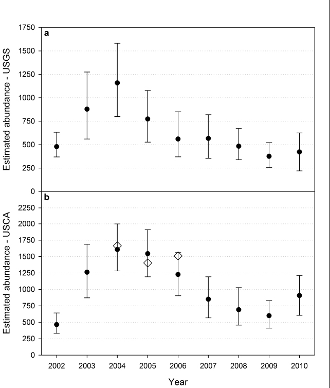 Abundance estimates based on the USCA data ranged from 464 in 2002 to 1,607 in 2004 (Fig. 5b). As with the USGS data, we suspect estimates for the initial years of the investigation were less reliable than those in the latter years, particularly because no capture effort occurred in Canada before 2003 and our models were not robust to this deficiency.