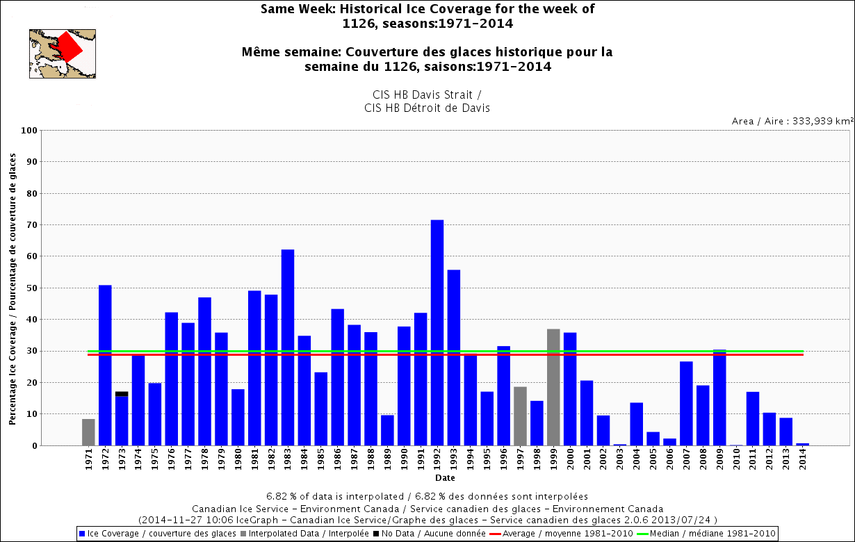 Since 1971, there have been only two years with as little sea ice in Davis Strait as there was this year in the last week of November – 2003 and 2010 (see below, click to enlarge).