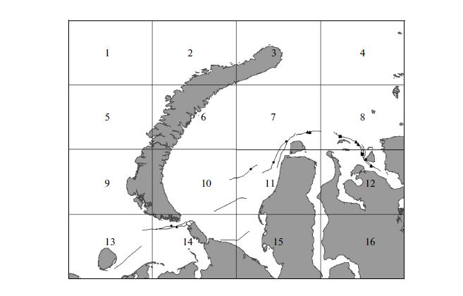Figure 2 from Matishov et al. 2014, showing areas covered by the survey in 2013. Original caption: “Schematic map of division of the counted territory in January–March 2013 into 16 sectors of separate extrapolation. Circles, triangles, and squares mark the meetings of individual bears, females with one bear cub, and females with two bear cubs, respectively.”