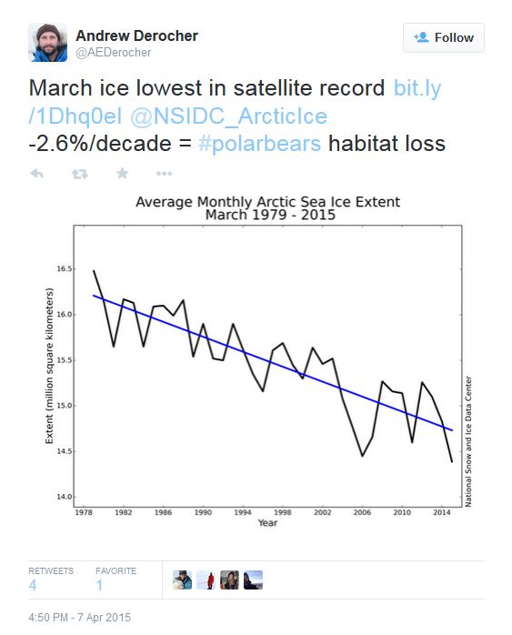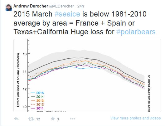 Derocher’s attempt to spread misinformation about the 2015 record low March extent in relation to polar bear habitat was the second within a week — it followed on the heals of another tweet he sent a few days earlier (copied below), which I countered here: