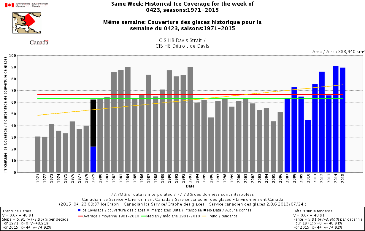 Over in Davis Strait, 2015 is tied for 2nd highest extent for this week (along with 1983 and 1993) – last year (2014) was the highest. The long-term trend since 1971 calculated by the Canadian Ice Service for ice coverage this week in Davis Strait is increasing (Fig. 4, below).