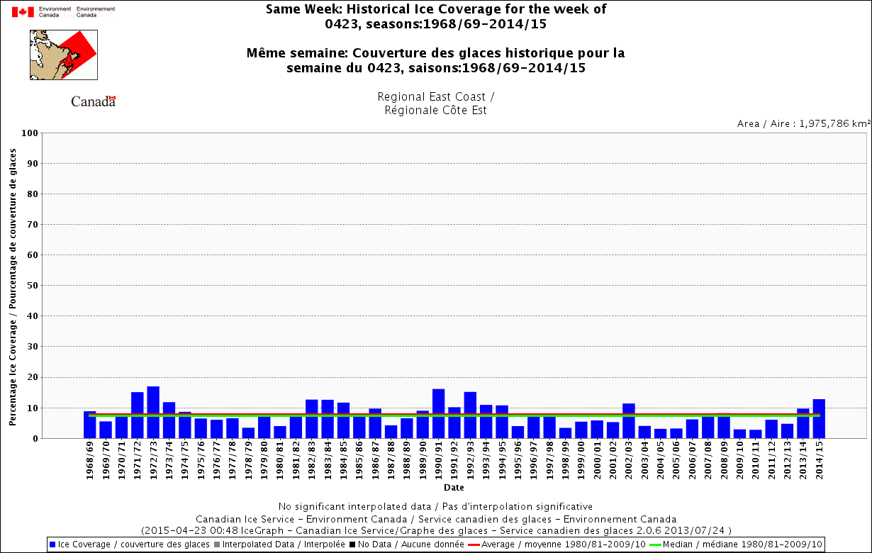 For the Canadian East Coast as a region, ice is well above average for this date (note the quasi-decadal undulating pattern since 1969, from above average to below and back, although this has not been quite so pronounced since the early 2000s):