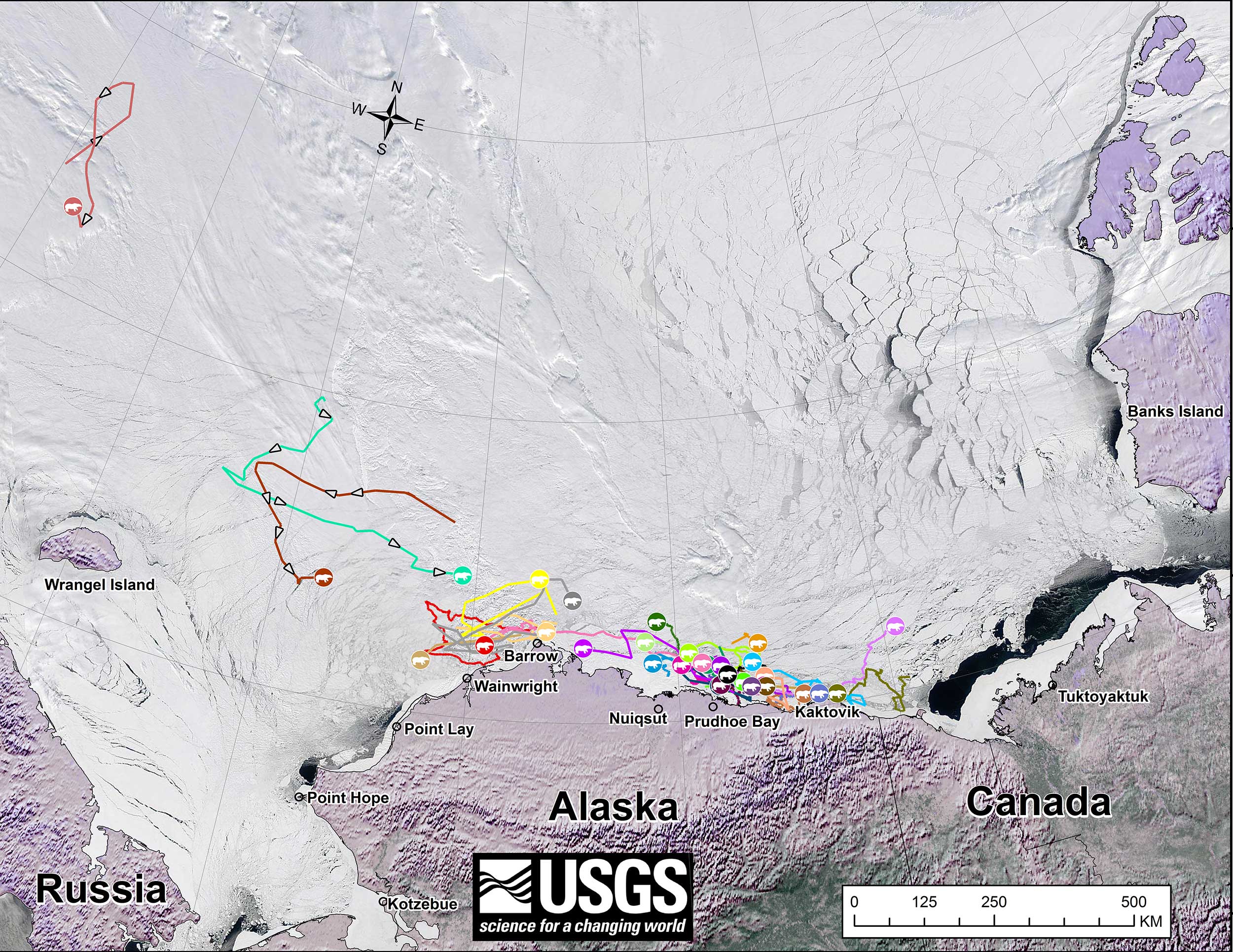 Figure 2. From original caption: “Movements of 24 satellite-tagged polar bears for the month of April, 2014. Polar bears were tagged in 2013 and 2014 on the spring-time sea ice of the southern Beaufort Sea. Seventeen of these bears have satellite collar transmitters and 7 of these bears have glue-on satellite transmitters. Polar bear satellite telemetry data are shown with MODIS imagery from 26 April, 2014.” Click to enlarge. Original image here.