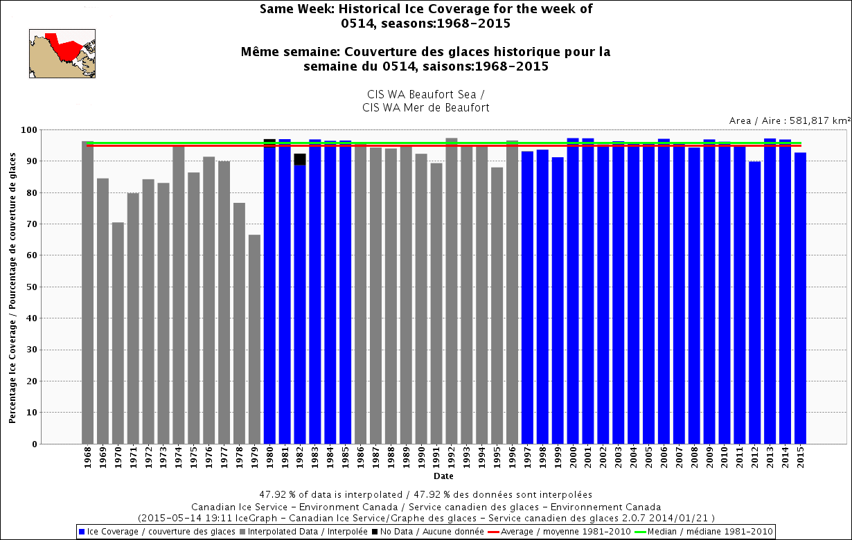 Figure 5. Ice cover in the Beaufort Sea for the week of 14 May, 1968-2015, using Canadian Ice Service data. Click to enlarge.