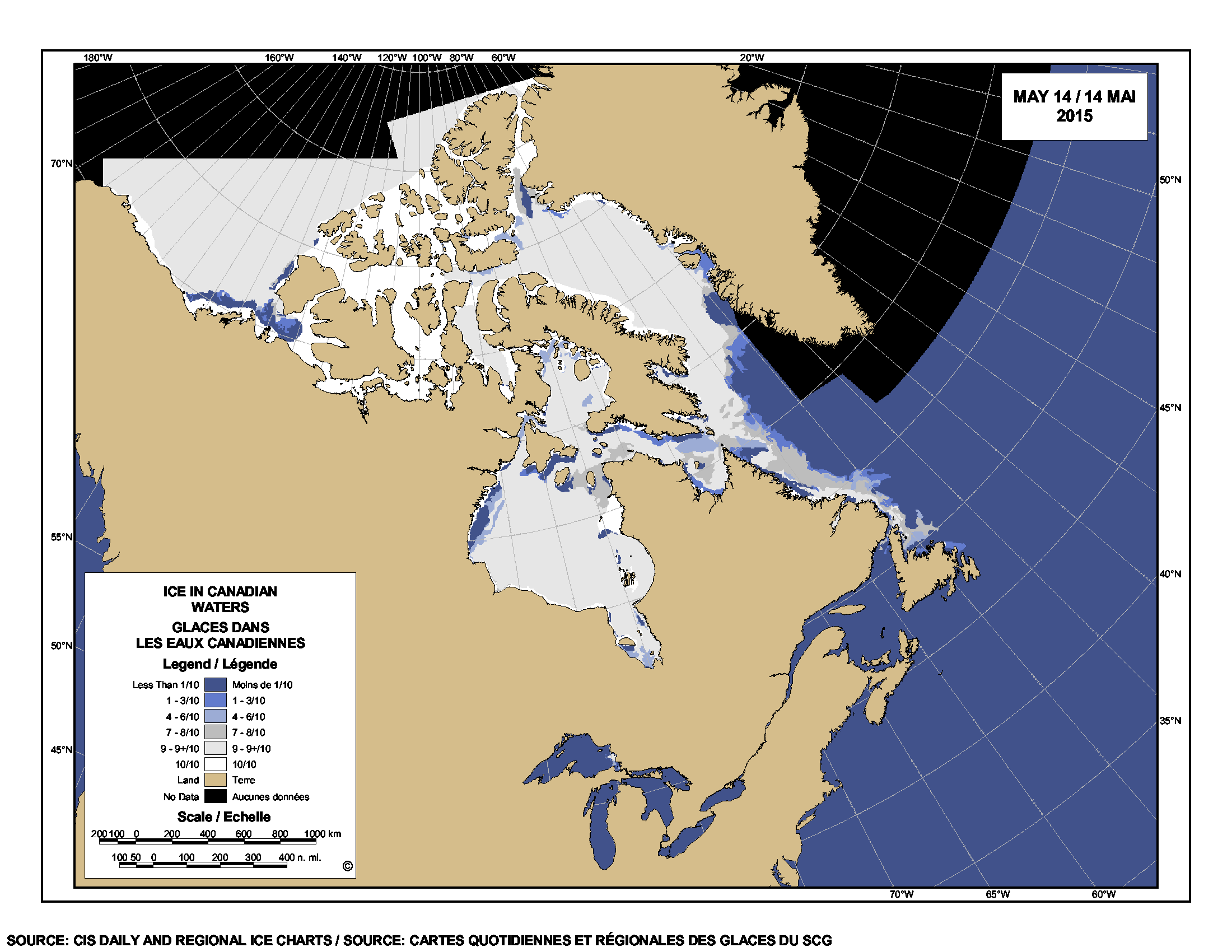 Figure 4. Sea ice coverage over Canada at 18 May 2015. Not much has changed since last week (at 14 May, opening image above). Click to enlarge.